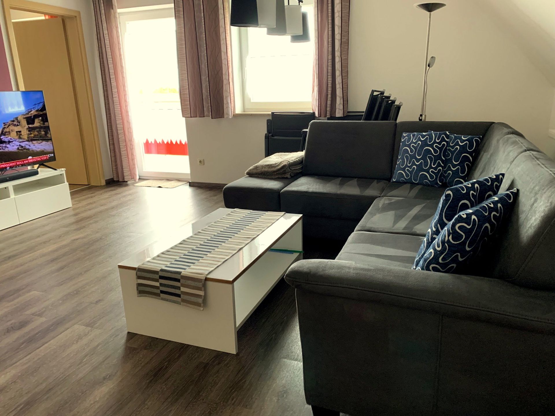 Wohnzimmer mit Lederausziehcouch, Anbauwand, Fernseher und großem Balkon und Hochterrasse sowie Sonnenschirm, Stühle und Tische sind vorhanden. Sie parken auf unserem Grundstück. Fahrräder und Sportgeräte können Sie in unserem abschließbarem Abstellraum sicher unterbringen.